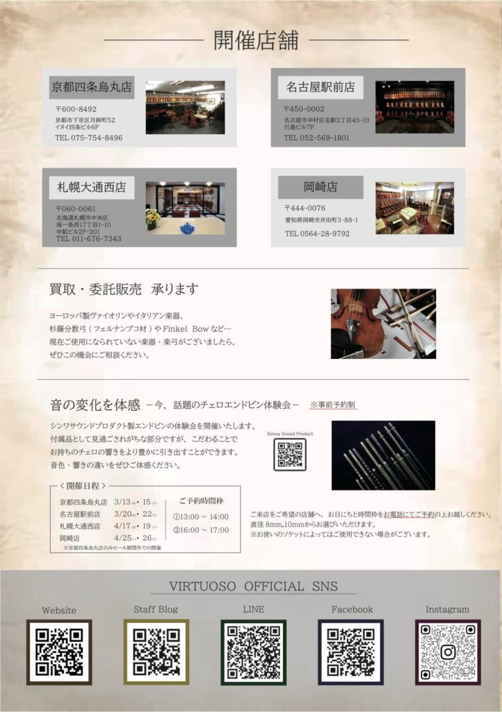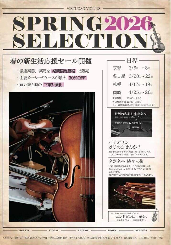 また、新たに入荷したイタリアン楽器やフレンチボウ、ヨーロッパのアンティーク楽器も数多く揃います。